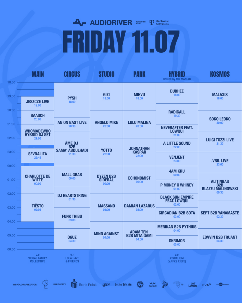 W tym roku odbywa się już 19. edycja słynnego festiwalu muzyki elektronicznej. Po zeszłorocznej przeprowadzce z historycznej stolicy Mazowsza wydarzenie na stałe osiadło się w Łodzi, od dawna związanej z polską sceną muzyki elektronicznej. Na audioriverowej scenie występowały takie gwiazdy jak Four Tet live, Victoria z Måneskin b2b Partiboi69, Sevdaliza, czy Modeselektor live. Od pierwszej, bezpłatnej edycji w 2006 roku festiwal przeszedł długą drogę. W tym roku odbywa się w dniach 11-13 lipca na Łódzkich Błoniach.